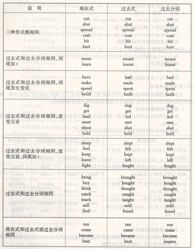 现将不规则动词简单分类,它们的现在式(动词原形),过去式和过去分词见下表: