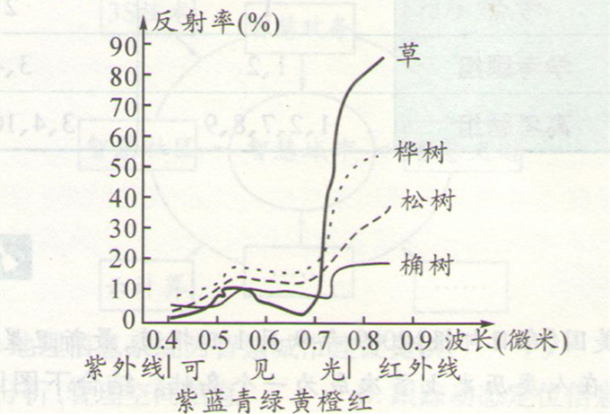 第(2)题,根据材料一中的图可知,绿光波段桦树的反射率最高;红外线波段草的反射率最高。