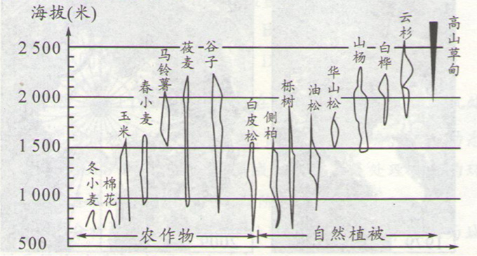 材料二根据高分辨率遥感影像绘制的山西省太原以南地区植被的垂直分布图。