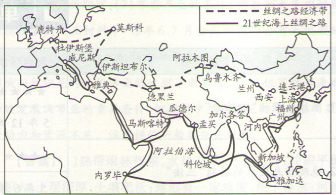 【例1】(2015·江苏高考)2015年是“一带一路”(“丝绸之路经济带”和“21世纪海上丝绸之路”)国家战略积极推进年。下图为“一带一路”主要线路示意图。读图回答下题。
