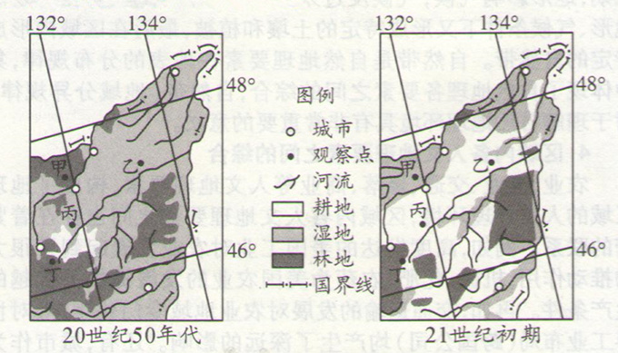 高考)经过半个多世纪的开发,三江平原草甸、沼泽大多已利用。下图为三江平原部分地区土地利用变化示意图。完成(1)、(2)题。