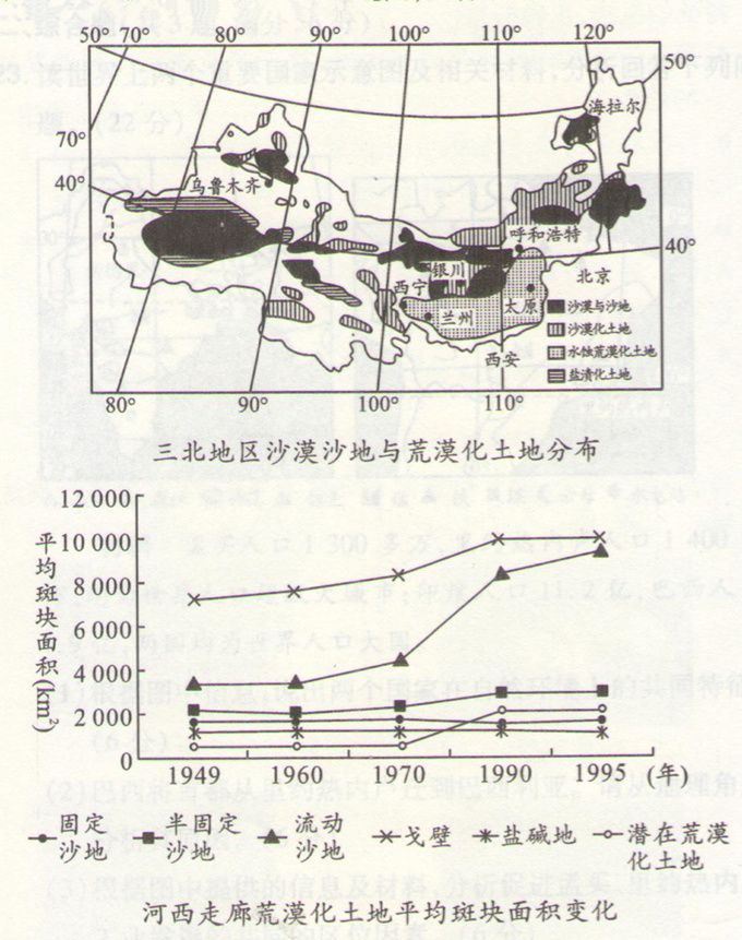 【例1】读三北地区沙漠沙地与荒漠化土地分布图和河西走廊荒漠化土地平均斑块面积变化图,回答下列问题。