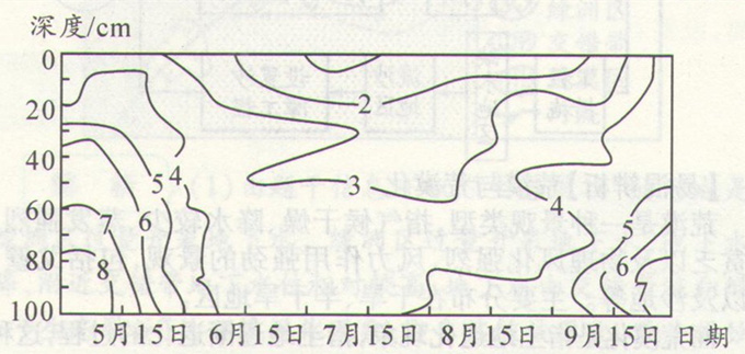 【例5】(2016·海南单科)下图示意一固定沙丘某年5-9月土壤水分含量(%)随深度的变化。该沙丘位于毛乌素沙漠的南缘,无人为扰动,多年保持稳定。据此完成下面(1)~(3)题。