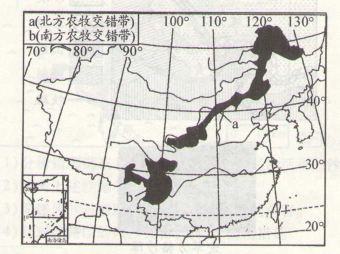 农牧交错带是生态系统较为脆弱的地区。读我国农牧交错带分布范围图。完成6、7题。