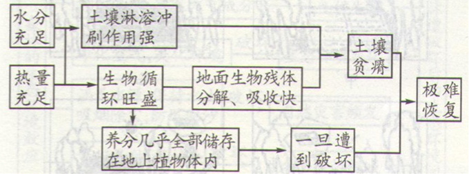 雨林的脆弱性主要体现在雨林一旦被毁,地表养分将迅速被径流带走,整块土地的肥力就会急剧下降,地表植被也就很难恢复。其成因如下图所示: