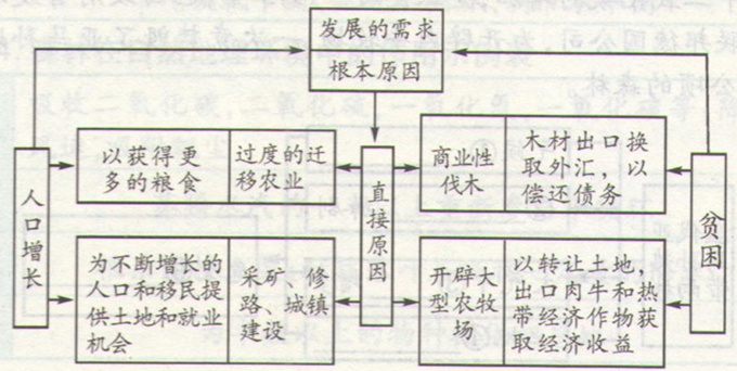 (3)根本原因:人口增长和贫困导致的发展需求。直接原因:过度的迁移农业;商业性伐木;采矿、修路、城镇建设;开辟大型农牧场等。