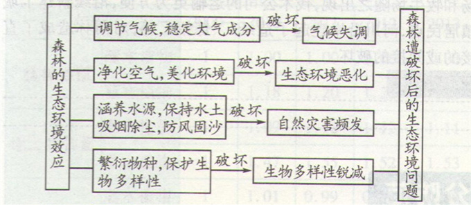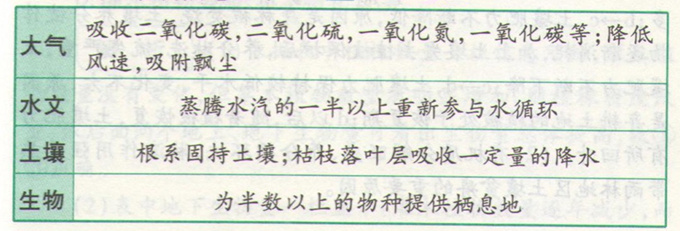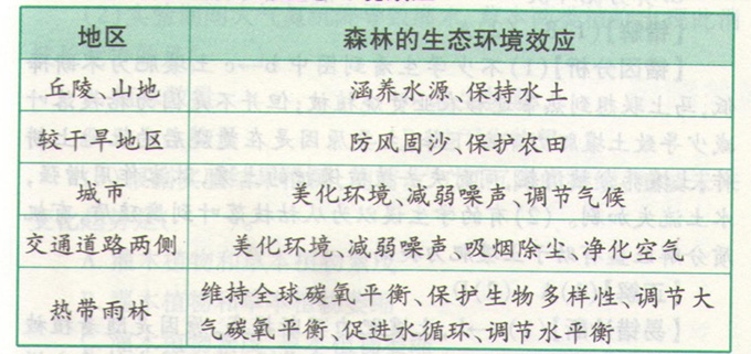 森林的生态环境效应可以归纳为七个字:“水气净美无(物)尘沙”。所对应的意思分别是:水—一涵养水源、保持水土;气—调节气候、稳定大气成分;净—净化空气;美—美化环境;物——繁衍物种、保护