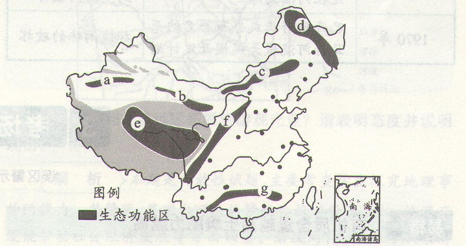 (2)e位于青藏高原上,多湖泊和河流的源头,规划为生态功能区,可以起到保护湿地、涵养水源的作用。