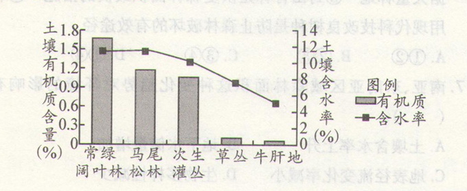 【解析】该地出现了牛肝地(红层荒漠),说明演化过程是由常绿阔叶林到荒漠的过程,因此土层厚度减小,土壤肥力降低;图示过程随着常绿阔叶林到牛肝地的变化,土壤有机质含量和含水率不断下降;而土壤是由矿物质、有机质、水分和空气四种物质组成,则土壤中矿物质比重和空气含量增大了。