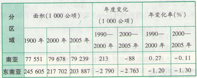 下面为南亚、东南亚森林面积变化表。读表,完成下面6、7题。