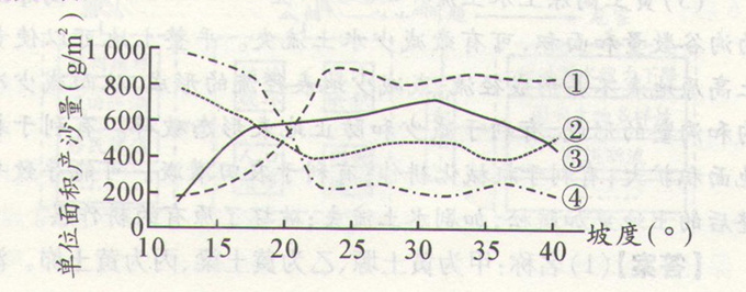 . (2)上图是几位同学根据调查结果绘制的坡度与单位面积产沙量关系曲线图,其中符合水土流失一般规律的是()。