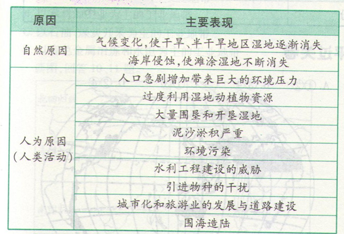 . 长江中下游平原湿地成因:降水丰富;河湖较多,地表水丰富;地势低平,洪水易泛滥,排水不畅。