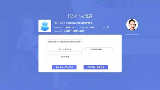 【说明】:考生核对个人信息,若信息无误则点击“确认无误,进入考试”,进入正式考试。若发现不是考生本人信息,则点击“信息有误,重新登录”按钮。