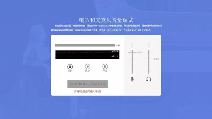 【说明】:该环节为进入正式考试前,考生通过自己录制一段测试音,再播放测试音的形式检查喇叭和麦克风设备是否正常。检查无误后,即可进入正式考试。若检查有问题,请及时向监考人员说明情况。