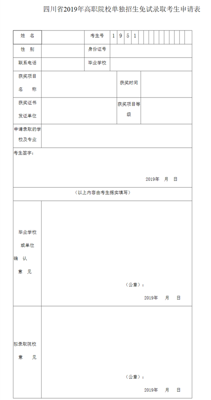 在校期间参加由教育部主办或联办的全国职业院校技能大赛获得一、二、三等奖和由省级教育行政部门主办或联办的全省职业院校技能大赛获得一等奖的中职应届毕业生,完成高考报名手续后可向相关的高职院校提出申请,由学校组织考核,认定合格者录入相关专业,不再参加高职单招考试。具有高级工或技师资格(或相当职业资格)、获得县级劳动模范先进个人称号的在职在岗中等职业学校毕业生,经省教育厅核实资格、高等职业学校考核公示,并在教育部高考平台公示后,可由有关高等职业院校免试录取。所有符合免试录取条件的考生应参加高职单招报名,并在3月底前向学校提交《四川省2019年高职院校单独招生免试录取考生申请表》(见附件2)。在正式办理免试录取于续前,申请考生应正常参加报考院校的高职单招考试。
