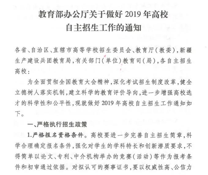 附件:教育部办公厅关于做好2019年高校自主招生工作的通知