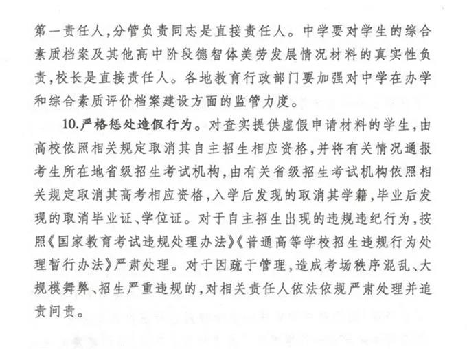 对查实提供虚假申请材料的学生,由高校依照相关规定取消其自主招生资格,我省将依照相关规定取消其高考相应资格,入学后发现的取消其学籍,毕业后发现的取消毕业证、学位证。对于自主招生出现的违规违纪行为,按照《国家教育考试违规处理办法》《普通高等学校招生违规行为处理暂行办法》严肃处理。对于因疏于管理,造成考场秩序混乱、大规模舞弊、招生严重违规的,对相关责任人依法依规严肃处理并追责问责。