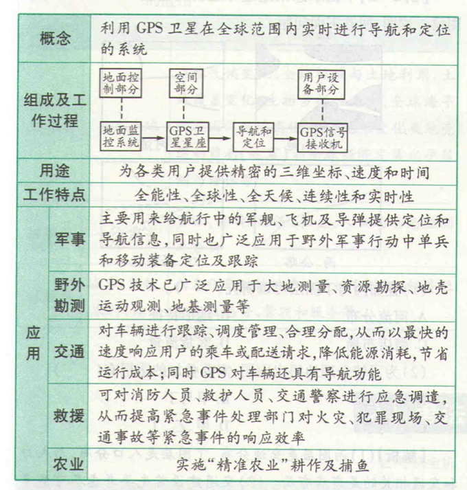 二、全球定位系统(GPS)的功能、工作过程及应用如下表所示: