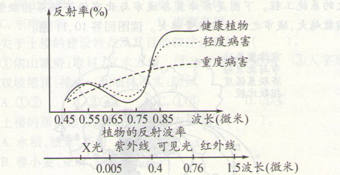 (1)可直接从图中找出健康植物与重度病害植物反射率曲线的交点,向横坐标作垂线,可以看出重度病害植物反射率高的波段大致是0.58~0.80微米,结合光谱波段图,很容易确定A、C选项。