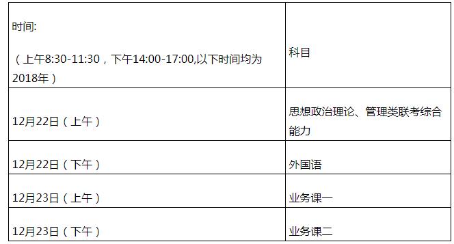 初试时间:2018年12月22日至23日。(每天上午8:30-11:30,下午14:00-17:00)